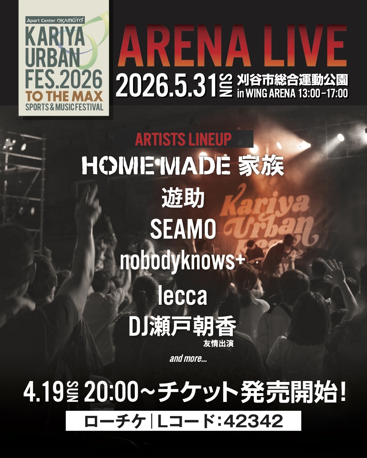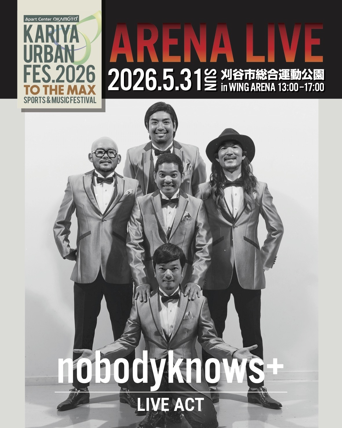 2026年5月31日(日)に愛知県刈谷市のウイングアリーナ刈谷(刈谷市総合運動公園)にて『KARIYA URBAN FES.2026 -TO THE MAX!!-』の開催が決定!昨年に引き続きnobodyknows+の出演が発表されました!