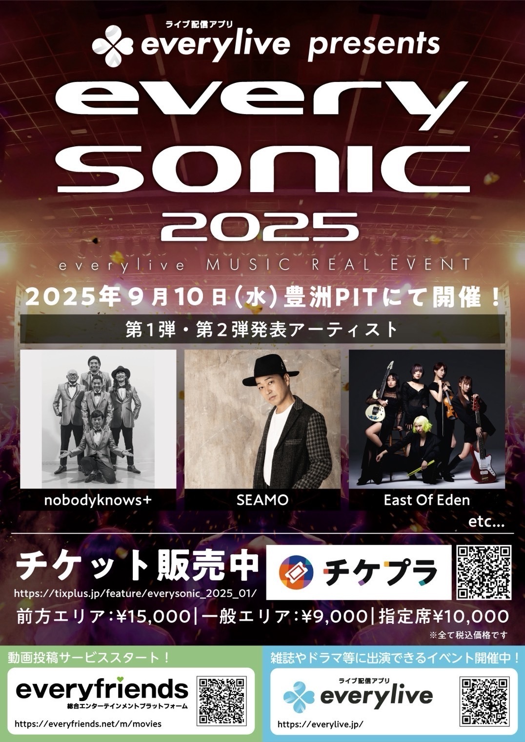 ライブ配信アプリ『everylive』主催による音楽イベント『every sonic 2025』が2025年9月10日(水)、東京・豊洲PITで開催決定!